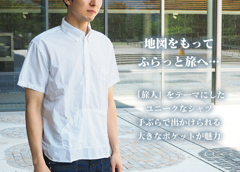 graphzero(グラフゼロ) トラベラーズ プルオーバー ボタンダウンシャツ タイプライタークロス 半袖 ホワイト メンズ [GZ-PO-SS3104-WH-MENS] 国内随一のジーンズ生産の街として知られる倉敷・児島の職人デニムブランドgraphzero(グラフゼロ)より、旅に使えるディティールがポイントのプルオーバーシャツが登場です! 「トラベラーズ(旅人)」というテーマでデザインされており、小さい山ポケには電車の切符を入れ、お腹の大きなポケットには地図や財布などを入れることができます。