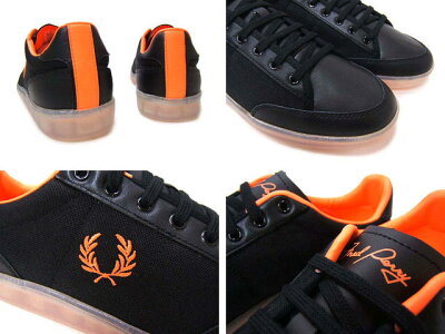 当社在庫/販社在庫手配(納期:3-4日予定!) 新セレクト!FRED PERRY フレッドペリー ユーロデザインで人気のレザースニーカー 素材:天然皮革/レザー/ナイロン カラー:BLACK/NEO ORANGE ★